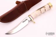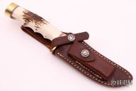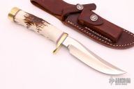 This Model 3-5 by Randall Made Knives has a satin finished blade with false top edge, .205" blade stock and 1.075" blade depth, hidden tang construction. The handle has a brass guard and butt, finger groove stag grip and red/white/blue spacers. Comes with a brown leather sheath. The very tip is slightly blunted, hard to even tell, otherwise excellent condition.