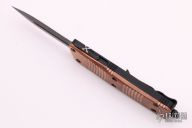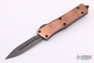 This Troodon by Microtech features a Damascus blade with a standard edges. The handle has a copper and black aluminum frame, black ringed hardware.   Tip down black stainless steel clip. Dated 03/2021. Includes the original box and papers. Excellent condition.
