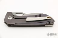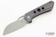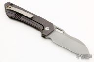 This Snoopy features a finely bead blasted sheepsfoot style blade with a thumbhole and a notched thumbrest.  The handle is composed of anodized titanium with an orange peeled finished titanium tip up pocket clip and backspacer.   Nice detent, lock up and blade seating.  Includes a padded velcro case.  Excellent condition.