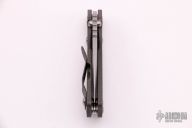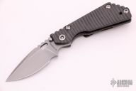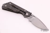 This PT by Mick Strider features a stonewashed blade with notched thumbrest and thumbhole. The handle has a flame finished titanium frame with matching tip up clip. New condition.