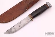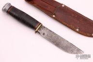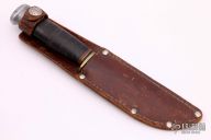 This Sport knife by Marbles was made in Gladstone Michigan. It features a satin finished blade with .147" blade stock, .886686" blade depth, hidden tang construction. The handle has a brass guard, stacked leather grip, aluminum pommel, black/brass/red spacers. Includes a brown leather sheath. Has patina, pitting and scratches, the very tip it gone, otherwise good condition for its age.
