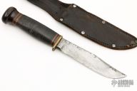 This Expert knife by Marbles was made in Gladstone Michigan. It features a satin finished blade with .167" blade stock, .953" blade depth, hidden tang construction. The handle has a brass guard, stacked leather grip, wood pommel, black/brass/red spacers. Includes a black leather sheath. Has some light pitting and the spacers are loose, has a nick in the blade, otherwise good condition.