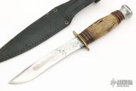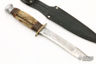 This Ideal Hunter by Marbles was made in Gladstone Michigan. It features a satin finished blade with fullers, .176" blade stock, .884" blade depth, hidden tang construction. The handle has a brass guard, pinned stag grip, aluminum pommel, black/brass/red spacers. It includes a brown leather sheath. Has some pitting and scratches, has been sharpened, otherwise fair condition for its age.