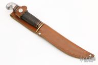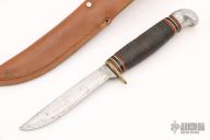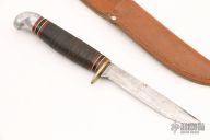 This Sportsman by Marbles was made in Gladstone Michigan. It features a satin finished blade with .084" blade stock, .627" blade depth, hidden tang construction. The handle has a brass guard, stacked leather grip, aluminum pommel, black/brass/red spacers. It includes a brown leather sheath. Has some pitting and scratches, has been sharpened, spacers are loose, otherwise fair condition for its age.