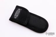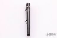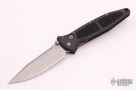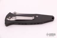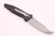 This Socom D/A tactical side-opening automatic by Microtech has a bead blasted plain edge blade. Dated 03/2002 and #1443. Has a black aluminum handle with rubber inserts, all hardware including clip is bead blasted. Strong action and nice lockup.  Has a couple very light scratches on the blade, otherwise excellent condition. Comes with original sheath.