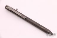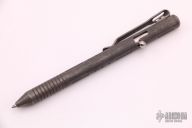 This unique bolt-action pen is made completely of titanium with the only exceptions being the ink cartridge, the spring, and the O-ring. Has a deep carry titanium clip. Comes in original plastic storage tube. Has a dark tumble finish. Has been used, has scuffs and scratches, otherwise good condition.