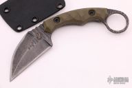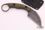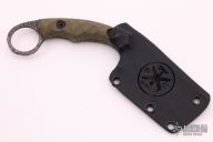 This Karambit by BC Bladeworks features a double edged tumble finished blade with textured ricasso and notched thumbrest, .160" blade stock and 1.417" blade depth, full tang construction with sculpted green G-10 scales. Comes with a kydex sheath. New from maker.