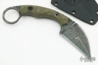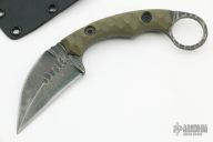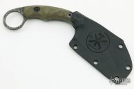 This Karambit by BC Bladeworks features a double edged tumble finished blade with textured ricasso and notched thumbrest, .160" blade stock and 1.417" blade depth, full tang construction with sculpted green G-10 scales. Comes with a kydex sheath. New from maker.