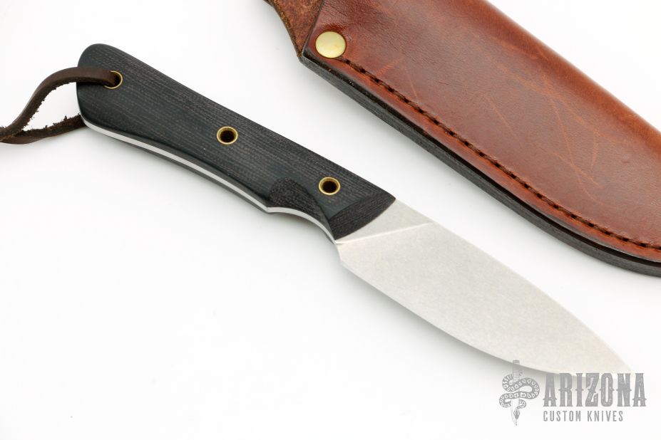 This Brave by Smith & Sons features a tumble finished blade with .126" blade stock and 1.028" blade depth, full tang construction. The handle has black canvas micarta scales with brass tube pins. Comes with a brown leather sheath, COA dated 7-20-18 and original box. Excellent condition.