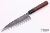 The is a long narrow kitchen knife with a thick blade made from Aogami Super Steel (AS) which is a high-carbon steel alloy with vanadium and is ground on both sides. As with all of Takeda's knives, it has a strong sharp edge. The octagon shaped wood handle is easy to hold. 159mm cutting edge, .194" blade stock and 1.496" blade depth. Comes with original box. Excellent condition.