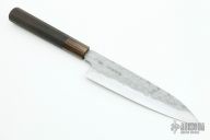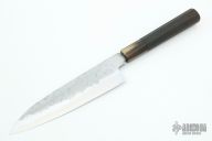 This Gyuto by Fujiwara features a laminated steel blade with Hitachi White #1 core and stainless clad, .136" blade stock and 1.775" blade depth, hidden tang construction with a wood handle and buffalo horn ferrule. Comes with original box. Excellent condition.