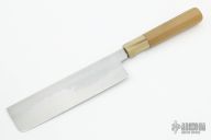 This Usuba by Fujiwara features a laminated steel chisel ground blade with Hitachi White #1 core and stainless clad, .128" blade stock and 1.775" blade depth, hidden tang construction with a wood handle and honey horn ferrule. Comes with original box. Excellent condition.