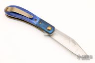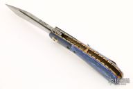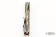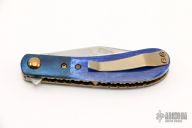 This Backpocket flipper from Doc Shiffer features a 1095 blade with hamon, fuller, notched thumbrest and flipper. The handle has NitreBlue Damascus bolsters, giraffe bone scales with red liners, fileworked and anodized titanium liners, tip up anodized titanium clip. The blade is centered when closed and locks up with no play, nice detent. Has a couple light scratches, otherwise excellent condition. Comes with a zippered case and COA dated 2-13-18.