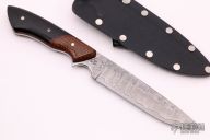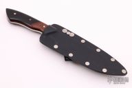 This knife by Master Smith Murray Carter features a San Mai Damascus blade with a false top edge, .127" blade thickness and 1.047" blade depth, full tapered tang construction. The handle has Thunderstorm Kevlar dovetailed bolsters, black G-10 scales with brown canvas micarta liners, nickel silver and mosaic pins. Comes with kydex sheath. Excellent Condition.
