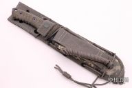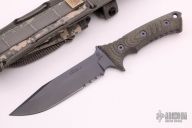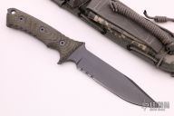 "Continuing the proud tradition of Chris Reeve Knives honoring elite military, the Reeve/Harsey collaboration - the Pacific - is the civilian version of a knife created to celebrate the 50th Anniversary of 1st Special Forces Group. Based in Ft. Lewis, WA, 1st Group's theatre of operations is Asia and the Pacific, so the name Pacific has been chosen to honor the home and work place of these fine soldiers." Comes with camo nylon spec-ops sheath. Has "ARDEJ" on the blade. .220" blade stock and 1.397" blade depth, full tang construction with black canvas micarta scales. Excellent condition.