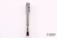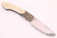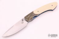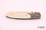 This knife by William Henry Fine Knives features a hand rub satin finished blade with single thumbstud with jewel inlay. The handle has sterling silver bolsters, ivory paper micarta scales, anodized titanium liners and backspacer. Comes with a brown leather slip sheath, and a William Henry Box. Excellent Condition.
