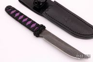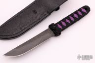 This Tanto by Mickey Yurco features a Damascus blade with .148" blade thickness and 1.020" blade depth. The handle has black cord wrap over purple ray skin. Comes with a black leather sheath. New from maker at the 2021 Blade Show.