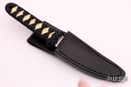 This Tanto by Mickey Yurco features a satin finished blade with .147" blade thickness and .923" blade depth. The handle has black cord wrap over white ray skin. Comes with a black leather sheath with rare earth magnets inside to hold the knife in place. New from maker at the 2021 Blade Show.