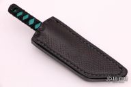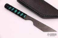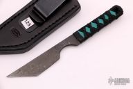 This Kiridashi by Mickey Yurco features a Damascus chisel ground blade and a cord wrapped handle with green ray skin underlay, .113" blade thickness and .807" blade depth. Includes a black kydex sheath. New from maker at the 2021 Blade Show.