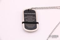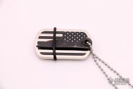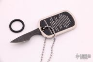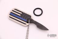 This dogtag neck knife by Mickey Yurco features a Damascus chisel ground blade attached to a Thin Blue Line dog tag. New from maker at the 2021 Blade Show.