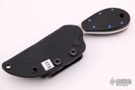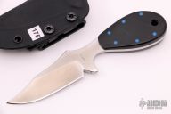 This knife by Mickey Yurco features a clip point satin finished blade with .148" blade stock and 1.247" blade depth, full tang construction. The handle has black G-10 scales with blue G-10 pins and a lanyard hole. Comes with a kydex sheath with a belt clip. New from maker at the 2021 Blade Show.