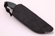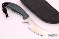 This knife by Mickey Yurco features a satin finished blade with .140" blade stock and 1.031" blade depth, full tang construction. The handle has green G-10 scales with black pins and a lanyard hole. Comes with a black leather sheath with elephant hide overlay. New from maker at the 2021 Blade Show.