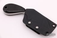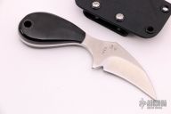 This knife by Mickey Yurco features a satin finished blade with .172" blade stock and 1.280" blade depth, full tang construction. The handle has black paper micarta scales with black canvas micarta pins and a lanyard hole. Comes with a kydex sheath with a belt clip. New from maker at the 2021 Blade Show.