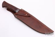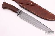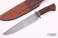 This bowie by Master Smith Josh Fisher features a Damascus blade with false top edge, .206" blade stock and 1.727" blade depth, hidden tang construction. The handle has a Damascus guard with a stainless steel spacer and fluted Damascus collar, desert ironwood grip with a single stainless steel pin. Comes with a brown leather sheath and zippered case. Excellent condition. This knife wears his Journeyman Smith stamp.