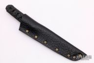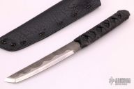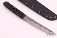 This is Kwaiken by Phill Hartsfield has a chisel ground tanto blade with nice hamon, .087" blade stock and .769" blade depth, hidden tang construction. The handle has epoxied cord wrap. Comes with a black leather sheath. Excellent Condition.
