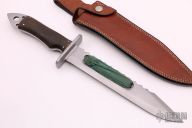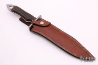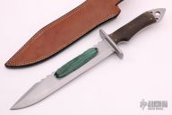 This fixed blade from Alex J Collins features a bead blasted clip point blade with sharpened top edge and sawteeth, has holes/fullers in blade with cordage, .233" blade stock and 1.429" blade depth, full tang construction. The handle has an integral guard and black canvas micarta scales with stainless steel pins. Comes with a brown leather sheath. Has some light spotting, otherwise excellent condition.