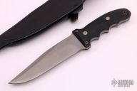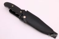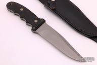 This Grey Ghost by the Late Jimmy Lile features a bead blasted clip point blade with sharpened top edge, .254" blade stock and 1.581" blade depth, full tang construction. The handle has black linen micarta scales with nickel silver pins and lanyard hole. Nice finger contours for comfort and grip. Comes with a black leather sheath. Excellent condition.