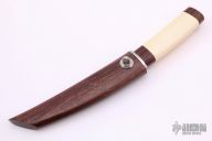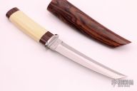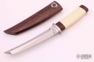 This Tanto by Ray Beers features a mirror polished blade with a false top edge, .178" blade stock and .892" blade depth, hidden tang construction. The handle has a stainless steel guard and a cocobolo and mammoth ivory grip. Comes with a matching wooden scabbard. #052 on the tang. Excellent condition.