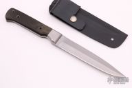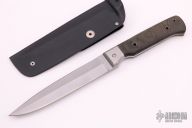 This Fighter by Pat Crawford features a bead blast finished blade with a sharpened top edge, .173" blade stock and 1.136" blade depth, full tapered tang construction. The handle has a bead blasted stainless steel bolsters and black linen micarta scales with red liners. Comes with a kydex sheath. Has a few light scuffs, otherwise excellent condition.
