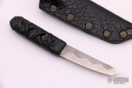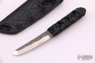 This is Mini Kwaiken by Phill Hartsfield has a chisel ground tanto blade with nice hamon, .087" blade stock and .512" blade depth, hidden tang construction. The handle has epoxied cord wrap. Comes with a black leather sheath. Excellent Condition.
