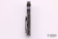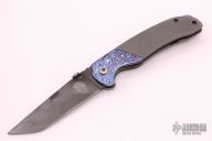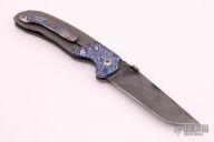 The framelock by Sheepdog Knives features and tanto blade with notched thumbrest and timascus thumbstud. The handle has timascus bolsters, bead blasted titanium frame with timascus tip up clip and floating backspacer. Comes with a zippered case. Rides on bearings, nice detent, lockup and blade seating. Has scuffs and scratches, otherwise good condition.