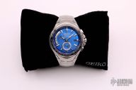 - The intricately patterned blue dial features a dual time display, power reserve indicator, date calendar, and LumiBrite hands and markers