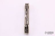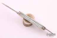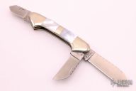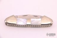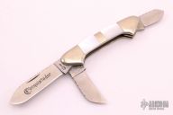 This slipjoint by United Cutlery features 3 satin finished blades with nail nicks and fileworked spines. The handle has nickel silver bolsters, mother of pearl covers, and fileworked stainless steel springs. Has some light scratches, otherwise excellent condition.