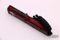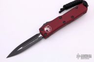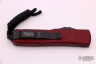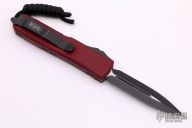 This UTX-85 OTF automatic by Microtech features a black double-edged blade. The handle has a merlot aluminum frame with all black hardware, tip down stainless steel clip. Serial number 48285 and dated 11/2019. Comes with Microtech box and papers.  Has some scratches on the clip, otherwise excellent condition.