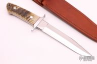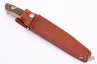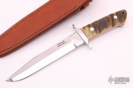 This Loveless style Fighter from James Sponaugle features a mirror polished blade with a sharpened top edge, .190" blade stock and 1.246" blade depth, full tapered tang construction. The handle has a mirror polished stainless steel guard, big horn sheep scales with red liners and spacers, lanyard hole at the butt. It comes in a custom brown leather sheath. Excellent condition.