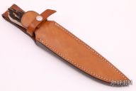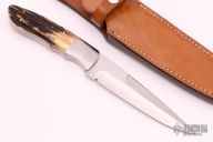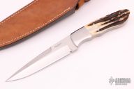 This custom fixed blade features a double-edged hand rubbed satin finish blade, with full tapered tang construction with .153" blade stock and 1.2" blade depth. The handle has satin finish stainless steel dove tailed bolsters, stag scales with red liners and stainless steel pins. Comes with a brown leather sheath. Light scratches on blade and bolsters, otherwise excellent condition.