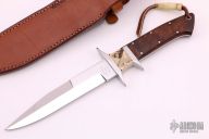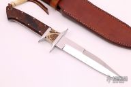 This Sub-Hilt Fighter by Tim Hartman features a mirror polished blade with false top edge, .192" blade stock and 1.065" blade depth, full tapered tang construction. The handle has mirror stainless steel guard and sub-hilt, stag and ironwood scales with stainless steel pins and a lanyard hole. Comes with a brown leather sheath. Excellent condition. Comes with COA
