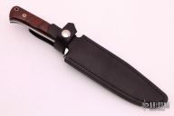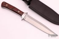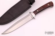This Fighter by Reese Weiland features a hand rub satin finished blade with sharpened top edge, .254" blade stock and 1.191" blade depth, full tang construction. The handle has a stainless steel guard with cocobolo scales and mosaic pins. Comes with a black leather sheath. Has a crack in one of the scales around one of the pins, otherwise excellent condition.