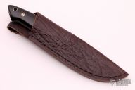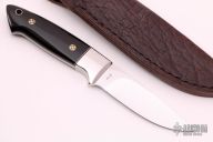 This Hunter by Gunther Muller features a mirror polished drop point blade with notched thumbrest, .126" blade stock and 1.045" blade depth, full tapered tang construction. The handle has polished 303 stainless steel bolsters, buffalo horn scales with black/white liners and mosaic pins, lanyard hole. Comes with a brown leather sheath. Excellent condition.