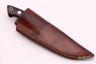 This custom fixed blade by Mitch Jenkins features a mirror polished drop point style blade, .176" blade stock and .951" blade depth full tapered tang construction. The handle has a mirror polished stainless steel guard and pins and ironwood scales with red liners. Includes a brown leather sheath. Nice fit and finish. Has a couple very light scratches, otherwise excellent condition.