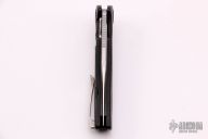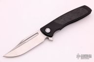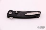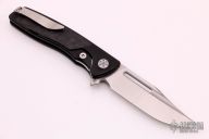 This Micro Evo from Brian Nadeau features a satin finished Bowie blade with a fuller and notched thumbrest. The handle has a black PVD titanium frame with marble carbon fiber inlays, satin titanium tip up clip. Rides on bearings, nice detent, lockup and blade seating, stainless lockface insert. There are a couple very light scratches on the clip. Box is slightly damaged. Excellent Condition.