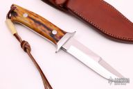 This custom Chute knife by Zac Buchanan features a mirror polished blade with 2" sharpened top edge, .191" blade stock and 1.027" blade depth, full tapered tang construction. Satin finished stainless guard and pins, stag scales with red spacers/liners. Includes a brown leather sheath. Has a few light scratches, otherwise excellent condition.