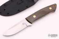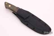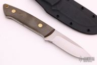 This K-DPII 2nd Generation Drop Point Hunter by Dozier Knives features a satin finished blade, .133" blade stock and 1.069" blade depth, full tang construction. The handle has green canvas micarta scales with brass pins and lanyard hole. Comes with kydex sheath with belt loop. New from maker.