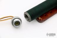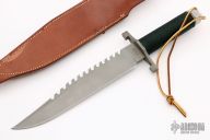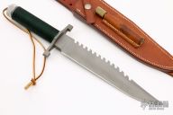 This Sly II has the Lile stamp with NO-dot and was custom made with 12 saw teeth. The Sly II was designed by Jimmy Lile to meet the demand for his famous "First Blood" knives. This knife has a 9" bead blasted blade with 12 saw teeth (8 double split teeth and 4 single), .243" blade thickness and 1.490" blade depth. The stainless steel handle is waterproof, foam wrapped, and hollow. The aluminum butt cap unscrews to reveal a compass, and allows you to use the hollow handle for storage. Comes with a brown leather sheath with sharpening steel. Has some light scratches, otherwise excellent condition.