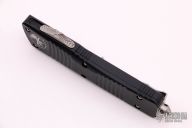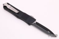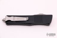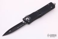This Combat Troodon OTF automatic by Microtech knives features a black double-edged double blade, and a black aluminum handle with bead blasted hardware, tip down carry. Glass breaker. S/N 18721. Dated 12/2017. Comes with original box and papers. Excellent condition.