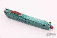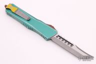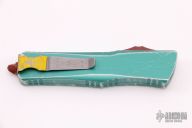This Combat Troodon Bounty Hunter by Microtech Knives features a Hellhound tanto blade with fullers, satin flats and apocalyptic finished grinds. The handle has a green battle worn aluminum handle with red hardware, tip down apocalyptic finished stainless steel clip.  Includes the original box.  Excellent condition. Dated 08/2019.